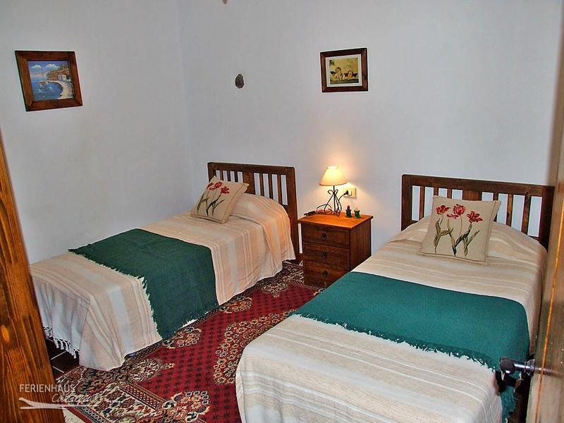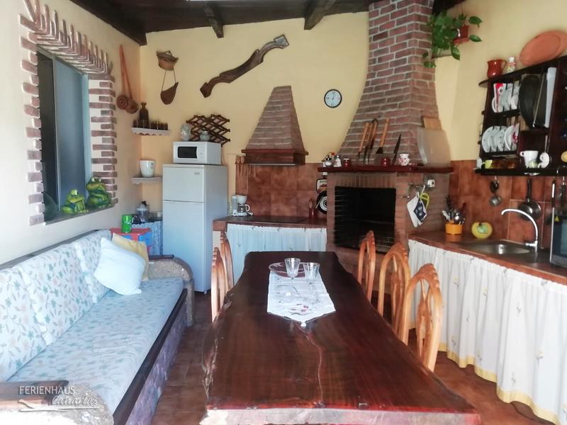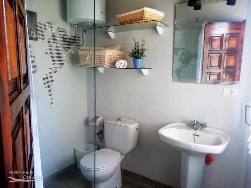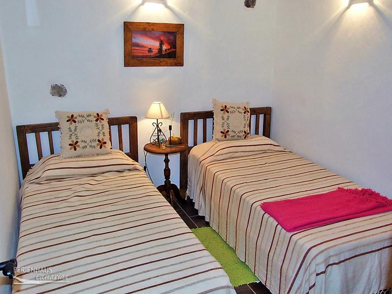 Die 60 m² große Ferienwohnungen ist mit 2 Schlafzimmer, Duschbad, Wohnraum, Küche und Terrasse für bis zu 4 Personen ausgelegt. Das Wohnzimmer ist klein und gemütlich und bietet SAT-TV und WLAN. In der Küche, urig kanarisch mit Kamin ist alles vorhanden das im Urlaub so gebraucht wird: Kühl-/Gefrierkombi, Mikrowelle, 4 Kochplatten, Kaffeemaschine, Toaster, Sandwichmaker, Mixer, Esstisch vorhanden.