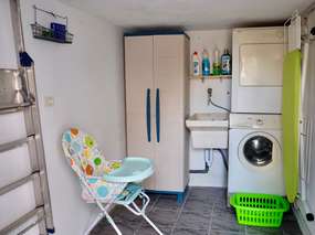 - Reinigungsraum mit Waschmaschine, Wäschetrockner und Spülbecken.
