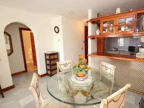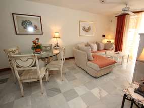 Im Wohnzimmer gibt es einen weiteren Fernseher, ebenfalls mit SAT-TV, sowie einen DVD-Player, Stereoanlage und einen Esstisch mit Bestuhlung. Vom Wohnbereich aus gelangen Sie direkt auf den möblierten Balkon.