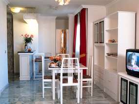 Neben einem Schlafbereich mit zwei Einzelbetten, finden Sie hier ein Bad mit WC, Waschtisch und Dusche und einen Wohnbereich mit Essecke und angrenzender amerikanischer Küche, die durch einen Tresen mit Barhockern vom Rest des Raumes abgegrenzt wird.