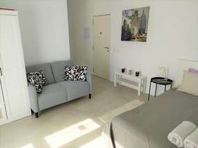 Das hier beschrieben Studio hat in etwa 30 m² aufgeteilt in einen hellen Wohn-Schlafbereich mit einer Couch, Smart-TV, einer Küchenzeile, einem Doppelbett und einem Badezimmer mit Dusche, Bidet und Waschmaschine.