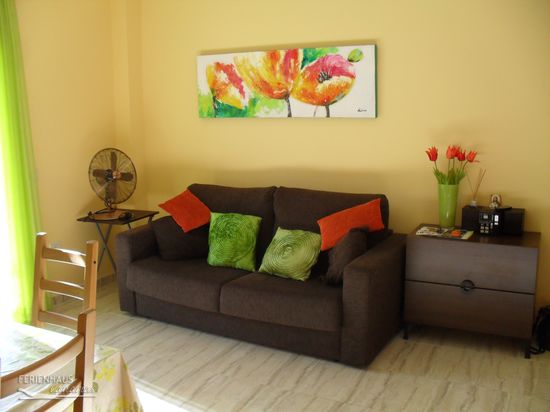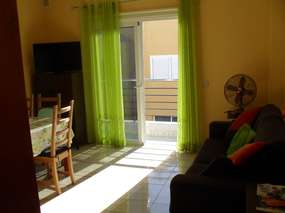 The modern flat is on the second floor and accessible by a lift, this makes it convinient for wheelchair user as well. The flat has a big living kitchen with a private furnished patio, a bedroom with a queen-size bed (1,40 x 2,00 m), a nursery with a bunk bed and a bathroom with bathtub and shower appliance. In the livingroom area is a couch which can be used as a bed as well. (1,40 x 1,90 m) and a dining table with 6 chairs. The kitchen has a stove with oven, a refigerator, mixer, toaster, a juice sqeezer, coffeemaker and more. The livingroom has next to the couch also a television, a stereo with CD player and USB Plug. For hotter or colder days the flat has a mobile air condition and a ventilator.