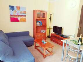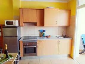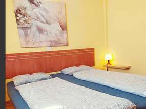 The living room contains convertible couch, TV with sat-TV and a kitchen bar. The bedroom has 2 single beds (90x190cm). The spacious bathroom contains shower, washbasin, bidet and WC. Bedlinen, towels, bath and tea towels are at your disposal, too. In the kitchen, you have oven, ceramic hob, fridge-freezer, toaster etc.