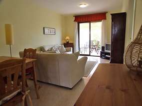 In the cosy living area there is a sofa corner and a dining table with chairs. Entertainment is provided by a TV (satellite TV), a DVD player and a music system.
