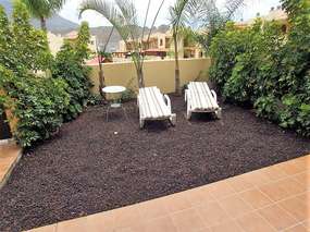 There are two beautiful terraces with a seating area and four chairs. The front one has its own private entrance and the other terrace, with a palmtree garden, sun loungers and direct access to the pool area, is on the east side.