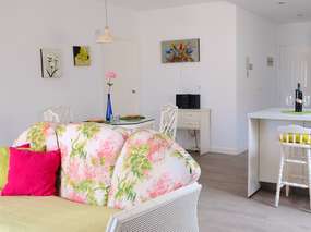 The living room has sofa, sat-TV, dining table and breakfast bar, which separates the American kitchen from the rest of the room. The kitchen has ceramic hob, microwave, oven, fridge-freezer, coffee machine, etc. Both bedrooms have 2 single beds (each 90 cm x 190 cm) and wardrobe. One bathroom has bath tub, the other one has shower. Towels and bedlinen are available.