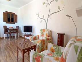 The living and dining area is comfortable and nicely decorated and has a TV with satellite connection, a sofa and a dining table. The kitchen is equipped with everything you need on holiday. Among other things, is in the kitchen , a stove, a Dolce Gusto coffee maker, microwave, kettle, toaster and other kitchen utensils.