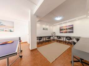 In the basement there is another living / bedroom designed as a hobby room with sofa bed, foosball, more sofas, TV and guest toilet. Since June '22, included in the price is another room in the basement with daylight, which can be used as a play and work room with 6 desks, a table tennis table, a dart board and a yoga/workout room with mats.