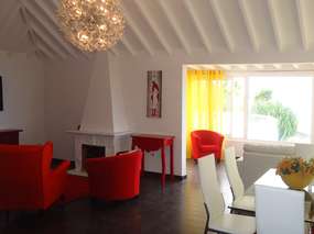 In the first and second bedroom is a double bed with two mattresses each (0,90x 2,00m). The third bedroom has a single bed. The bright living area has a sofa, a chimney, and a nice sitting area with a dining table for 6 people. You also have a panoramic view of the south coast and the sea. Next to the living area is the kitchen. The kitchen is provided with a gas stove, an extractor fan, a microwave, a big refrigerator (no freezer), a washing machine and more.