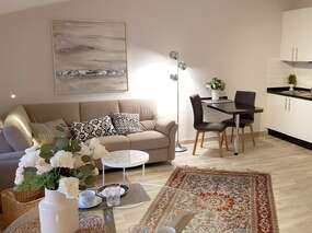 In the living area you will find a comfortable sofa and a modern open kitchen with oven, ceramic hob, fridge/freezer, coffee and Nespresso machine, microwave, kettle, toaster, crockery etc.... Fast WiFi and satellite TV are of course also available.