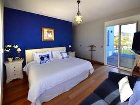 El dormitorio azul "Lanzarote" con cama de matrimonio es el más grande de la casa y dispone de un vestidor, un baño con ducha e hidromasaje y una terraza con vistas al Atlántico.