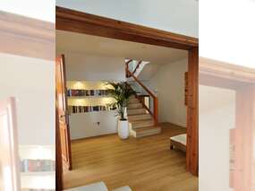 En planta baja, hay una acogedora sala de estar más pequeña (aprox. 20m²) con un gran sofá, una mesa de centro, un pequeño aparador con pantalla plana, así como grandes puertas que conducen a la aislada terraza de la barbacoa.