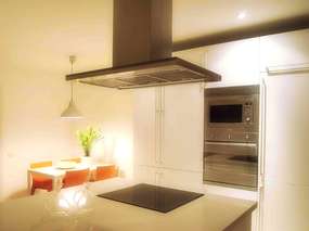 La cocina también cumple con los requisitos más exigentes: desde una moderna isla de cocción con vitrocerámica hasta un horno, microondas, lavavajillas y todos los pequeños electrodomésticos necesarios, como cafeteras de diferentes tipos, tostadora...