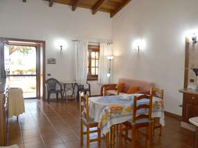 Het woongedeelte van het appartement heeft een open inbouwkeuken (fornuis, oven, koelkast met vriesvak, afzuigkap, servies, koffiezetapparaat enz.), een zitbank en satelliet tv.