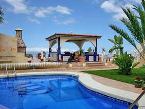 Zum Anwesen gehört ein ansprechenden Poolbereich, eine große Gemeinschafts-Terrasse mit Sonnenliegen und verschiedenen Sitzgelegenheiten, sowie ein gemauerter Pavillon im andalusischen Stil.